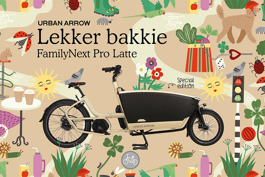 De Urban Arrow FamilyNext Pro Latte is een gelimiteerde uitvoering van de bekende FamilyNext bakfiets. Technisch gebaseerd op het meest complete model in de lijn, maar uitgevoerd in een stijlvolle en tijdelijke kleur Latte. Van deze uitvoering worden slechts 500 stuks geproduceerd. De adviesprijs van deze zeer comlpeet uitgeruste bakfiets ligt op €6.999.